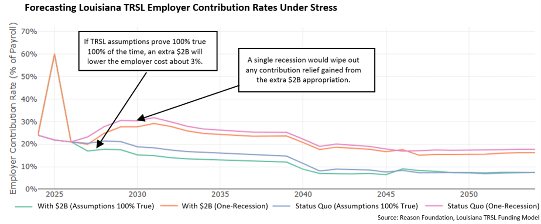 Indeed, a $2 billion supplemental contribution to the TRSL fund is expected to immediately lower the required employer contribution rate by about 3% and improve the system’s funded ratio by about 8%. The multi-billion dollar question is, what happens the next time investments underperform actuarial assumptions?