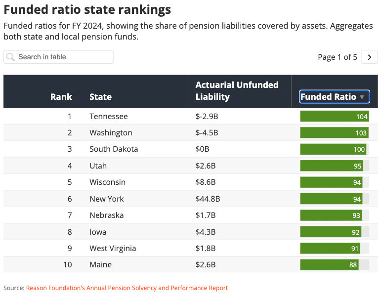 The Reason Foundation’s 2025 Pension Solvency and Performance Report ranks every state’s public pension system across five metrics, including funding levels, investment performance, and contribution discipline. The results reveal wide variation in fiscal health across states. Only three states have enough assets set aside to fully cover promised pension benefits. Visit the rankings here.