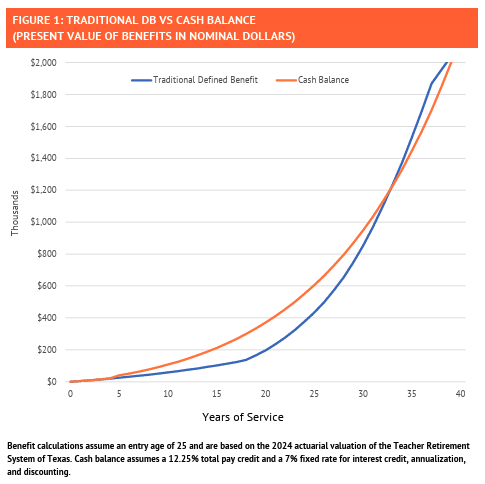 Reason Foundation’s paper “Best Practices in Cash Balance Plan Design” compares how benefits accrue between a traditional cash balance plan and a traditional defined benefit pension plan. While both plan types guarantee a level of returns to employees, cash balance plans can provide an advantage in benefits generated throughout the first 30 years of employment.