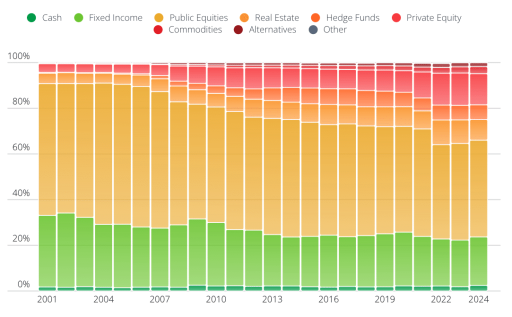 Reason Foundation’s Annual Pension Solvency and Performance Report illustrates changes to the asset allocation of public pension plans. In the early 2000s, public equities and fixed income made up roughly 85-90% of the typical pension portfolio. By 2024, traditional investments had shrunk to approximately 66% of assets. The difference went into alternatives like private equity, real estate, hedge funds, and private credit. Alternative investments used to represent 9% of public pension portfolios in 2001 but now make up 34% of total assets. Read the analysis here.